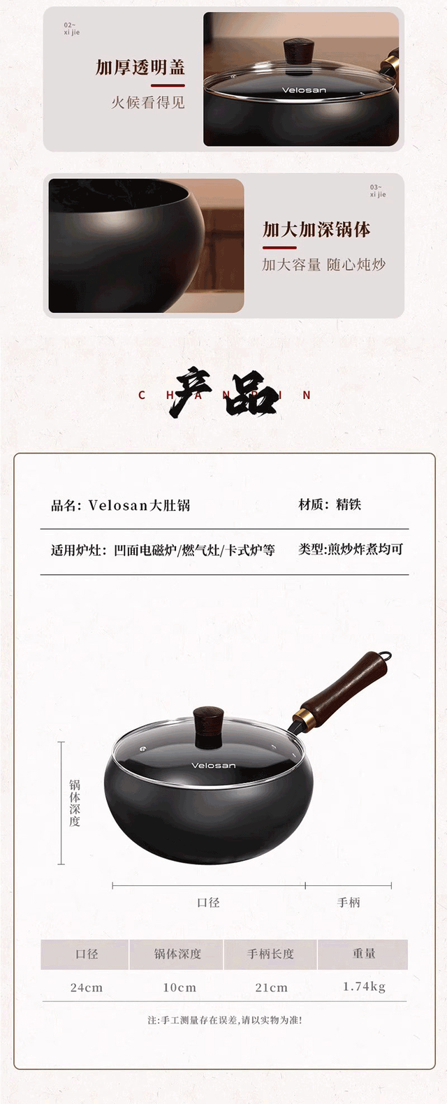 口径:24cm;锅体深度:10cm;重量1.74kg;适用人数:1-2人